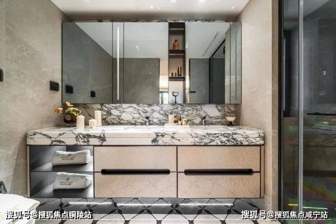 另外采用意大利 “大花白”天然石材实现地墙满铺,双台盆与双镜柜的对称设计复刻五星酒店规制,美妆冰箱精准控温呵护护肤品,奢华至极!