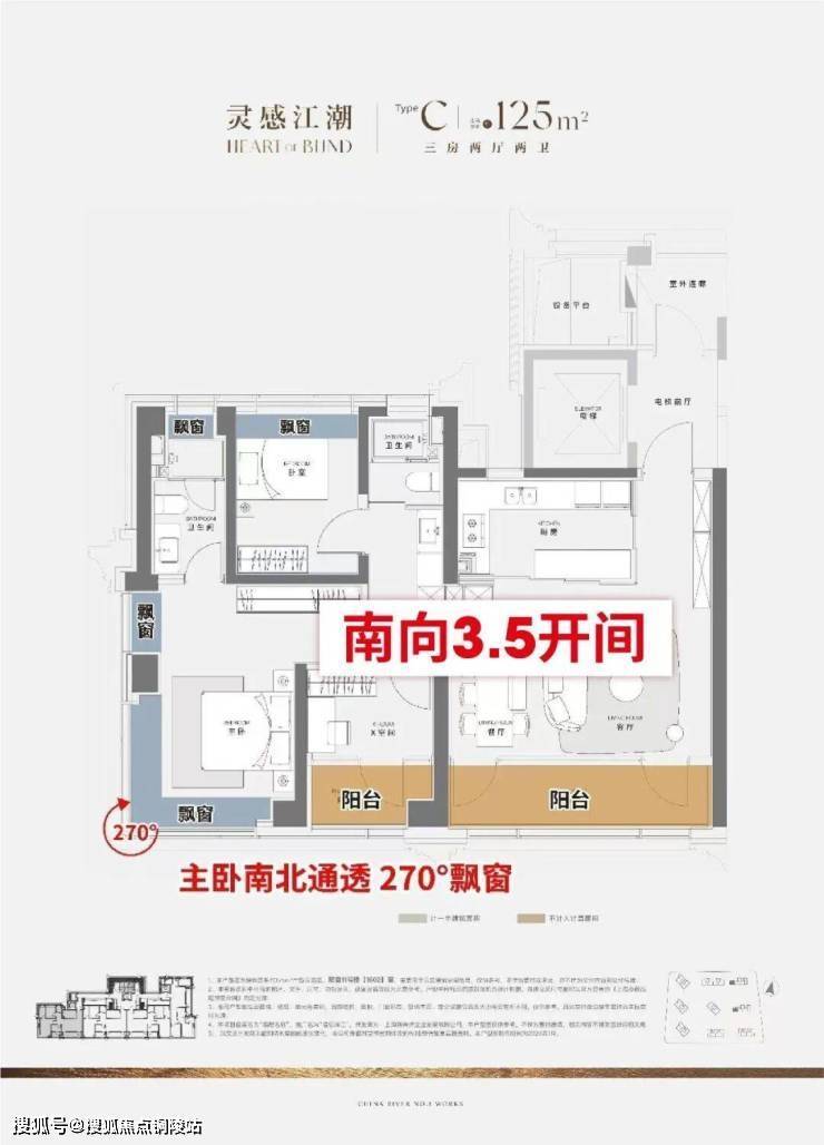南向3.5开间+双阳台+270°转角飘窗,让该户型的采光性能、空间通透感几乎做到极致!