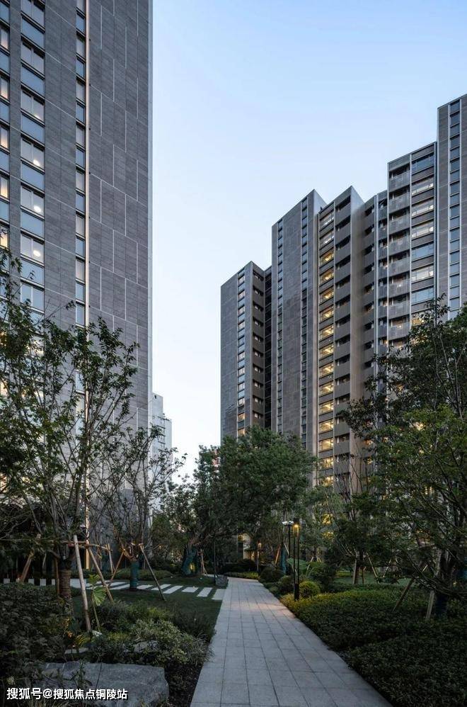 立面材料选取稍显沉稳的“皇室啡”花岗岩,其特殊的颜色与纹理,既能与北侧的办公统一色调风格,也能和周边现有的高容积率建筑,以及绿树成荫的街道环境融为一体,呈现低调精致、简洁大方的高品质住宅形象。