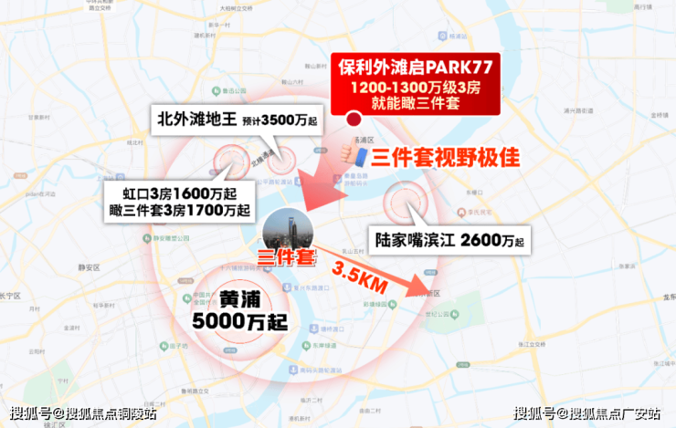 保利外滩启PARK77距离陆家嘴三件套直线距离约3.5公里。以三件套为圆心,环顾这3.5公里范围内的新盘,可以得出几个极具冲击力的结论: