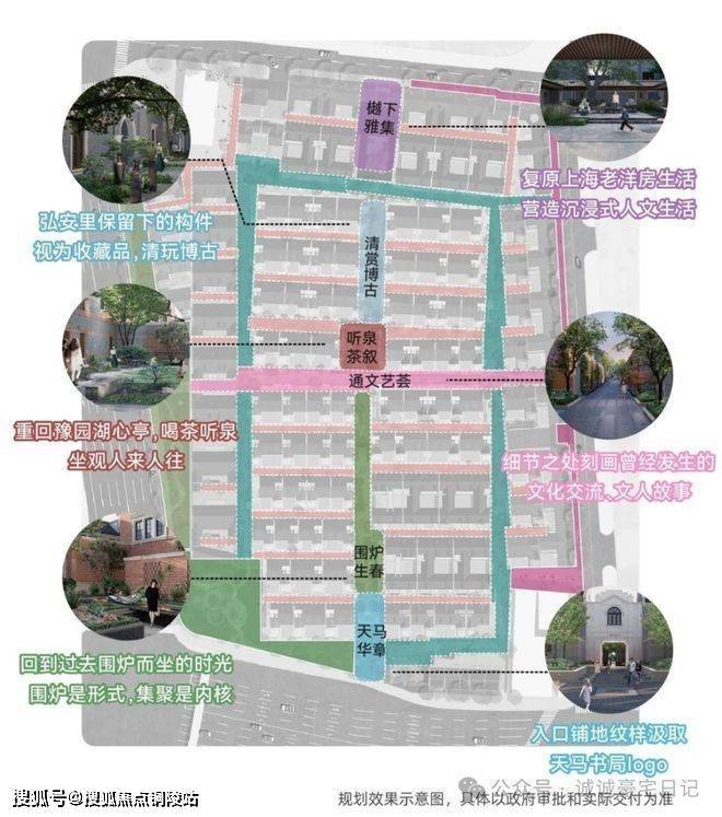 在社区的中轴上,弘安里植入记忆的符号与生活的画面,从入口处「天马华章」迈步前行,「围炉生春」「通文艺荟」「听泉茶叙」「清赏博古」贯穿到此次实景开放的「樾下雅集」,海派生活画卷昨日重现。