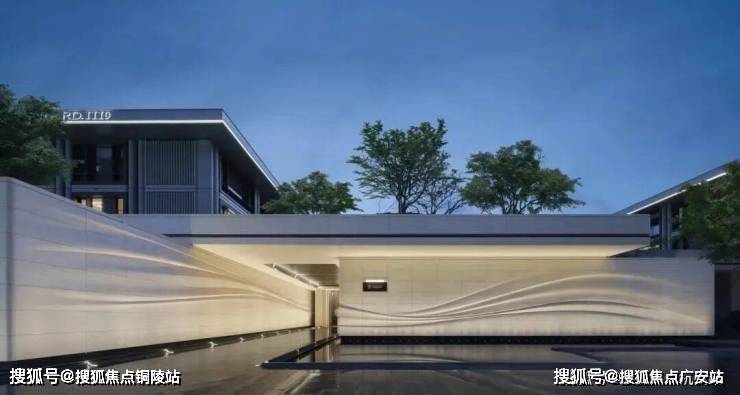 采用米黄色温润石材,巧妙模拟风的流畅形态,营造出既庄重又舒适的归家氛围。这片宽广的流线型石墙在柔和灯光的映衬下,更显璀璨夺目,而风雨连廊的灯带设计,更添一份尊贵仪式感。