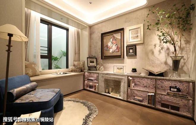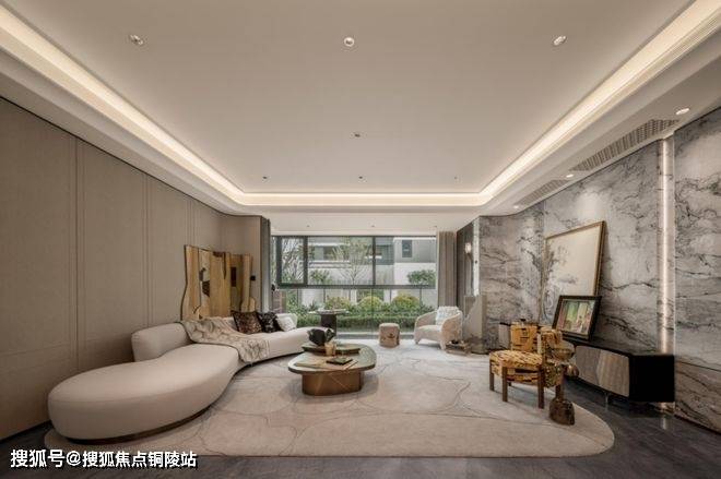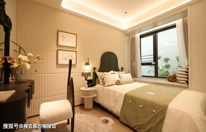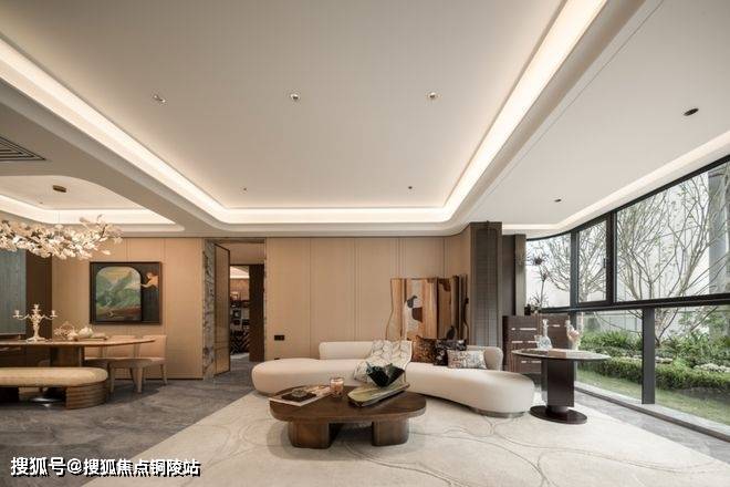 再来看看134㎡3室2厅2卫样板房。比起112㎡户型,这个客厅要宽敞很多,岛台也可以做成独立样式,摆放6人长桌也绰绰有余。主卧采用270度拐角飘窗设计,采光面拉满。