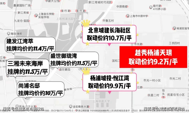 从宏观视角审视,五角场区域长期以来面临土地供应短缺的问题,自2016年起直至今日,仅有三宗土地进入市场。今年三月,该区域的土地成交均价达到每平方米9.2万元,而到了五月,北京城建集团联合其他企业以每平方米10.7万元的价格竞得土地,价格涨幅达到每平方米1.5万元。进入七月,随着土地拍卖政策的放宽,北京城建集团与越秀集团共同斥资22亿元购得长白社区项目,仅楼面价就高达每平方米70272元。换言之,越秀杨浦天玥项目目前是进入杨浦区市场的难得机遇。