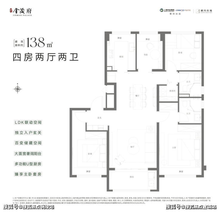 项目洋房全系无连廊设计,得房率高。如建面约138㎡户型,四叶草布局,南北通透,实得面积相当于一般高层住宅145㎡户型。除此之外,这个户型还有“真改善”不可或缺的三重优势: