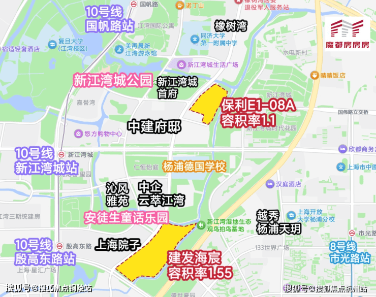 本次保利发展项目所在的E1-08A地块,容积率1.1,两面环水,毗邻城市副中心五角场。