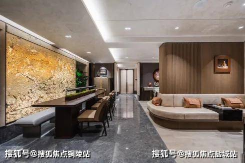 酒店式的社区大堂:精致的迎宾水景、苍劲滴翠的罗汉松,为城市的界面,增添一抹亮色,也让当代年轻人,在享受现代都市生活的同时,感受到家的温暖和亲切。蓝翡翠的奢石,以深邃幽远的尊蓝色基底,尽显光彩下的神秘奢华;而顶部异形的仿铜星空顶设计,用香槟金色斜角造型铝板搭配熠熠灯光,碰撞出科技与艺术的美学。