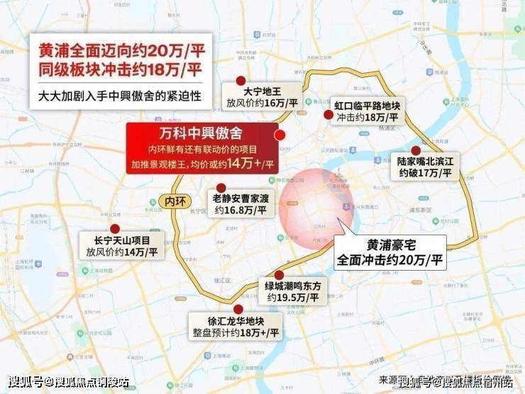 万科中興傲舍从上一次开盘至今,市场变化很大,新房价格疯涨,黄浦豪宅全线迈进20万/平;内中环徐汇滨江飙到19.5万/平,与项目同纬度的虹口内环冲击18万+/平;甚至不少内中环项目要卖到14-16万/平.(来源网上房地产以及楼板价倒推)