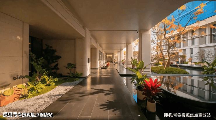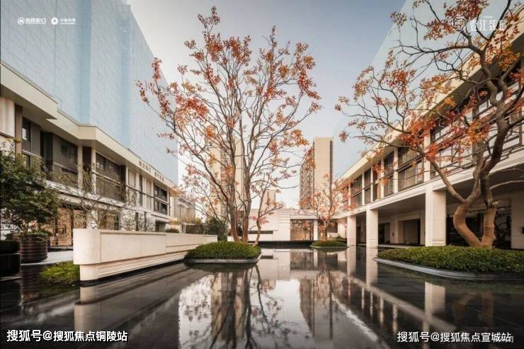 超千方镜面主题水院,时刻演绎自然与建筑的无界之美:澄澈镜面水面倒映建筑肌理与天光云影,搭配三株原生丛生乌桕的点缀,与回廊、浮岛相映成趣,营造出静谧雅致的亲水意境,这种沉浸式水景体验生活,在张江高端住区中尤为稀缺。