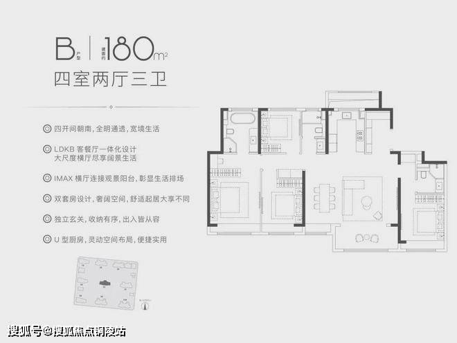 约172㎡和180㎡的4房3卫的户型,南向五开间朝南,