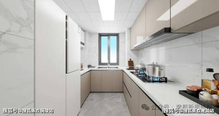 厨房为U型布局,配置定制橱柜、老板烟灶、林内热水器,台面为人造石,水槽为邦克台下盆,细节处体现人性化考量。
