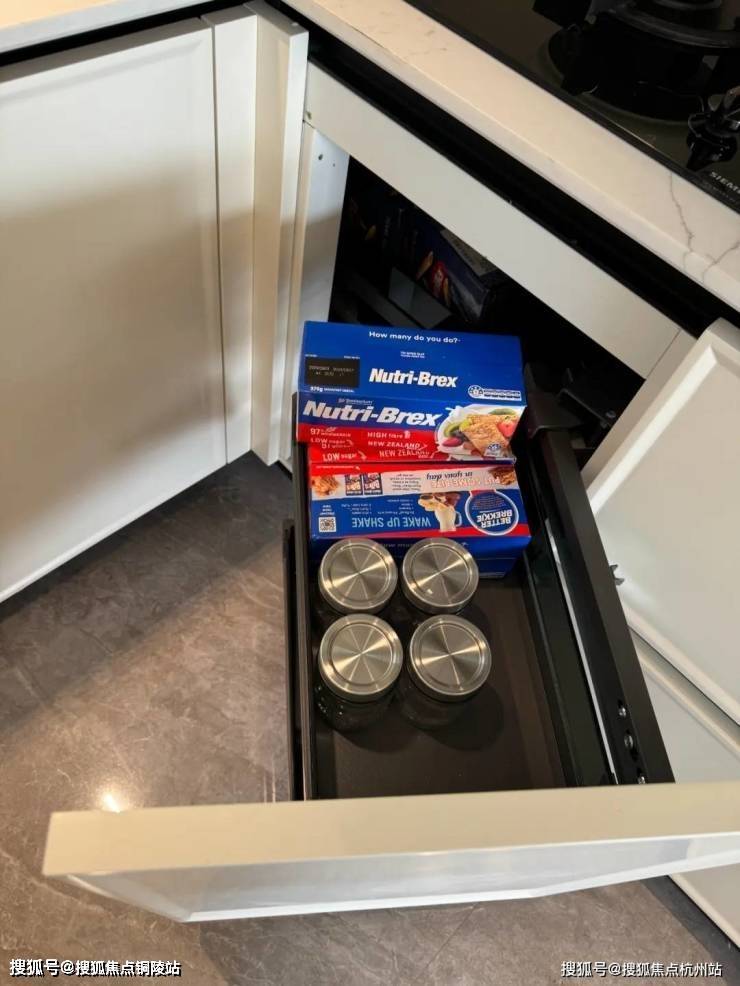 再来看下厨房配置。U型厨房,预留了大约1米宽(独家君实测)的双开门冰箱位置,厨电采用方太四件套——烟机、灶具、蒸烤一体机、洗碗机。其中洗碗机,轻扣门板可自动开门的新款!