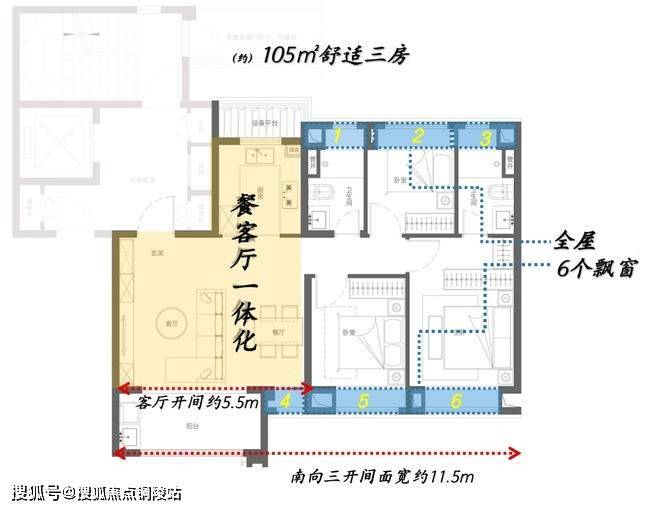 优越的窗墙比,可以最大限度将优美的景观纳入眼帘;南向三开间面宽更是达到了约11.5米,可以说市场同户型面积段产品很难做到这样极致化;功能房间以舒适度为导向服务生活,尺度均做到了当下主流产品水平之上;并且全屋附赠6处飘窗,高附加值令人心动。