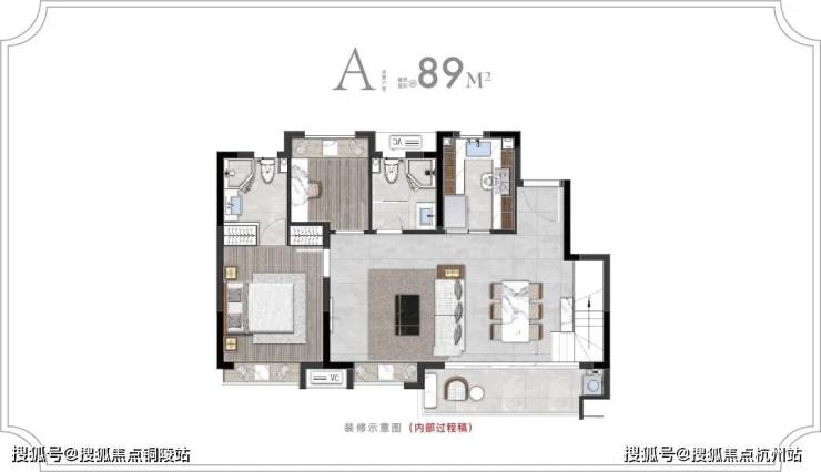 89㎡三房:三开间朝南、主卧套房、干湿分离,得房率 81%-85%,空间利用率高