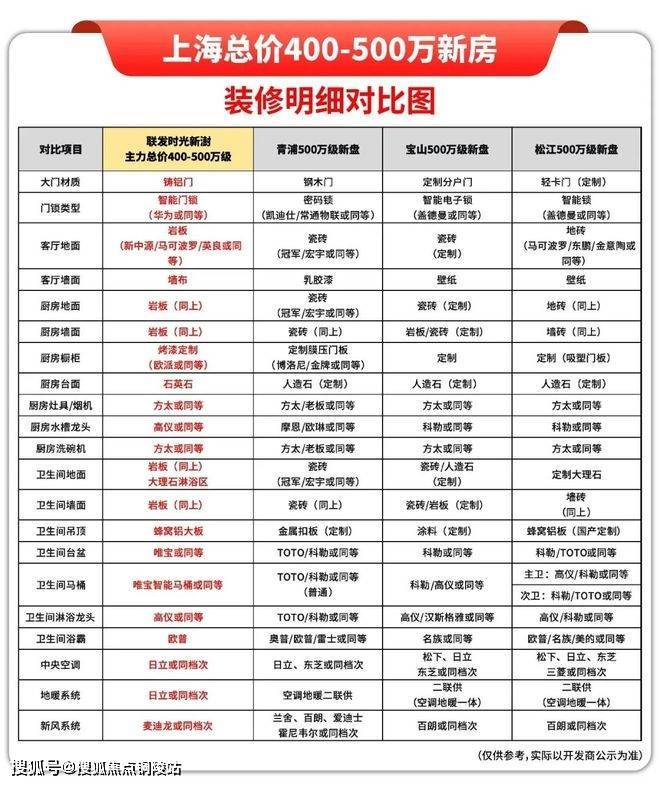 我把各区目前四百万比较热门的新房的装修标准做了横向对比: