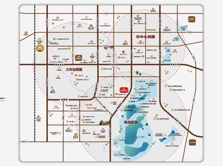 周边景观(自然景观,公园绿化):南湖公园、唐山市规划展览馆、唐山大剧院、唐山宴、南湖生态旅游风景区;