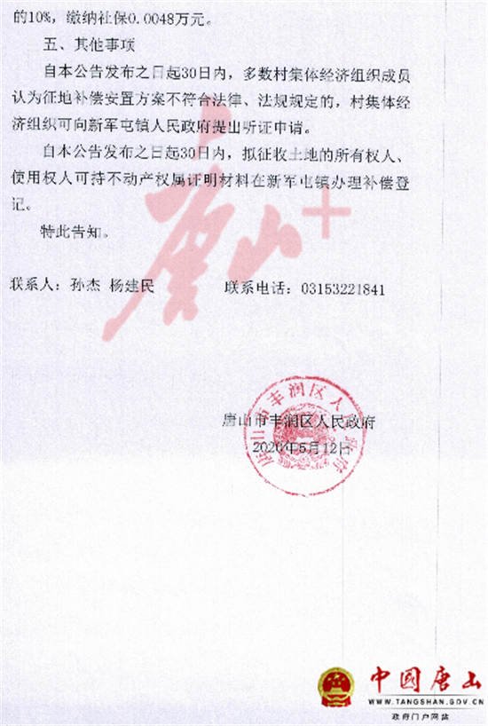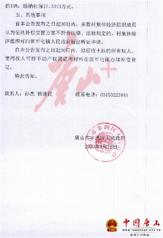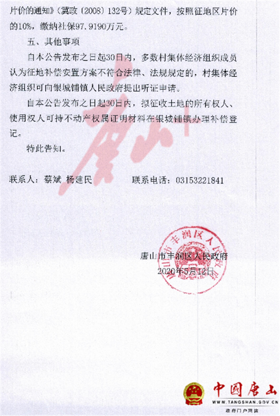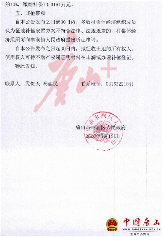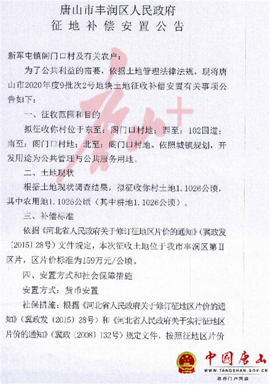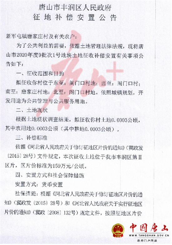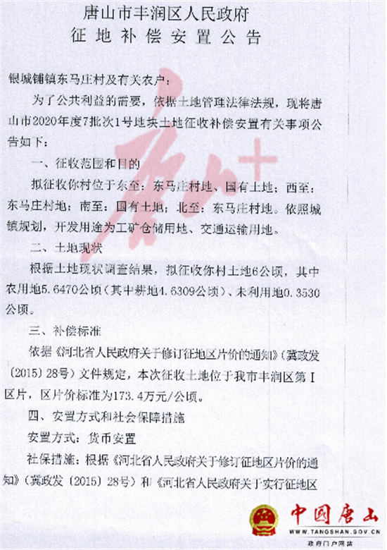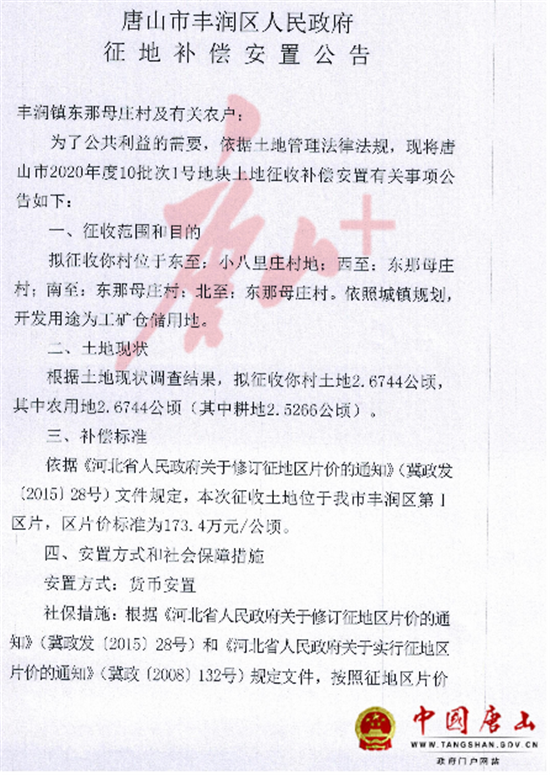 5月12日,中国唐山网站发布《唐山市丰润区人民政府征地补偿安置公告》,涉及丰润区多个村庄。详情如下: