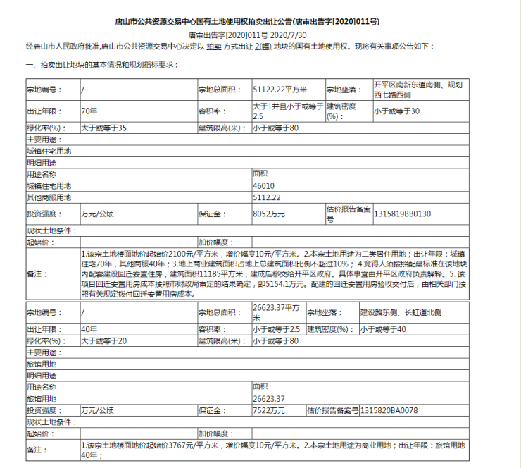 唐山市公共资源交易中心国有土地使用权拍卖出让公告