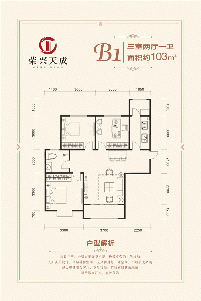 3室2厅1卫-B1三室两厅一卫103㎡户型