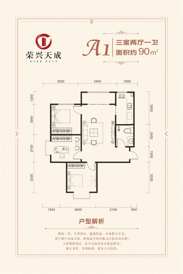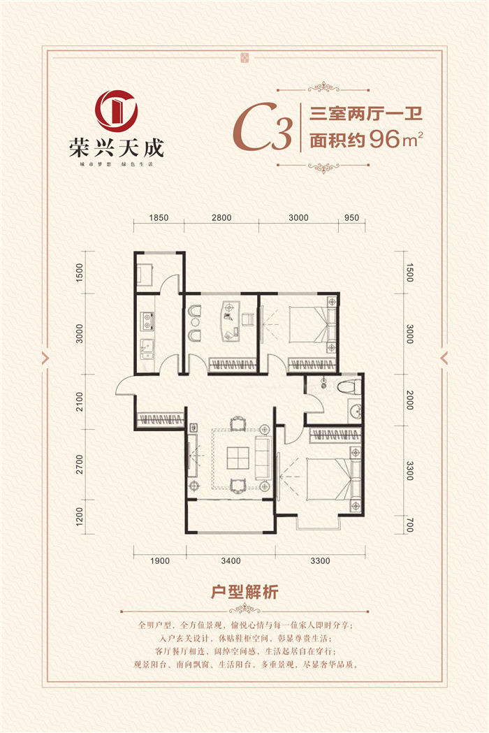 3室2厅1卫-C3三室两厅一卫96㎡户型