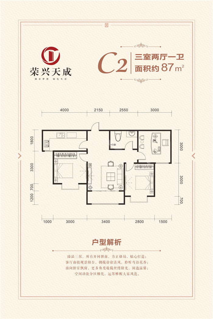 3室2厅1卫-C2三室两厅一卫87㎡户型