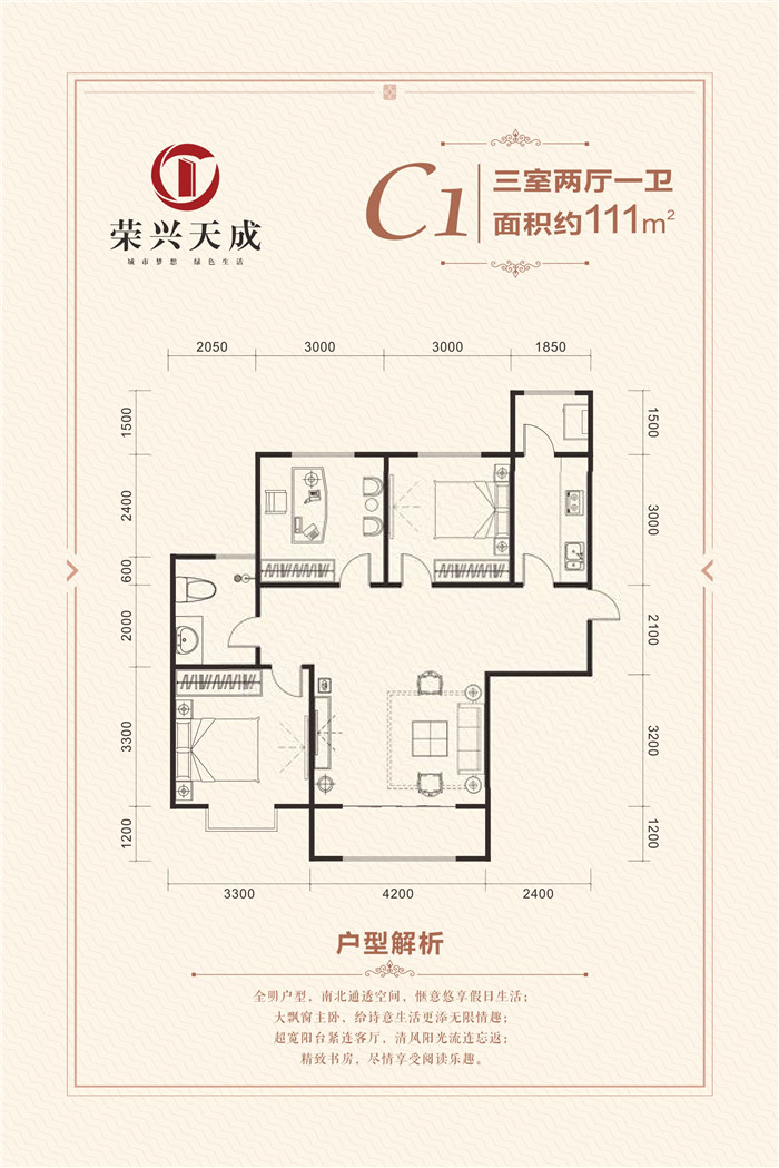3室2厅1卫-C1三室两厅一卫111㎡户型