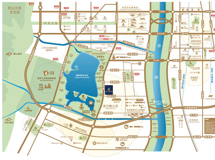 2.休闲娱乐:晋阳湖公园、奥体中心、晋阳里(在建)、奥特莱斯(规划)、华侨城缤纷水岸(规划)、奇柯未来MALL(规划)、汾河公园、广电中心(规划)、悦榕庄(规划)、如梦晋阳(规划)