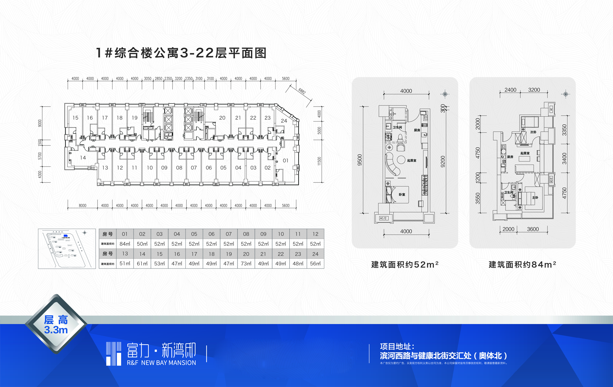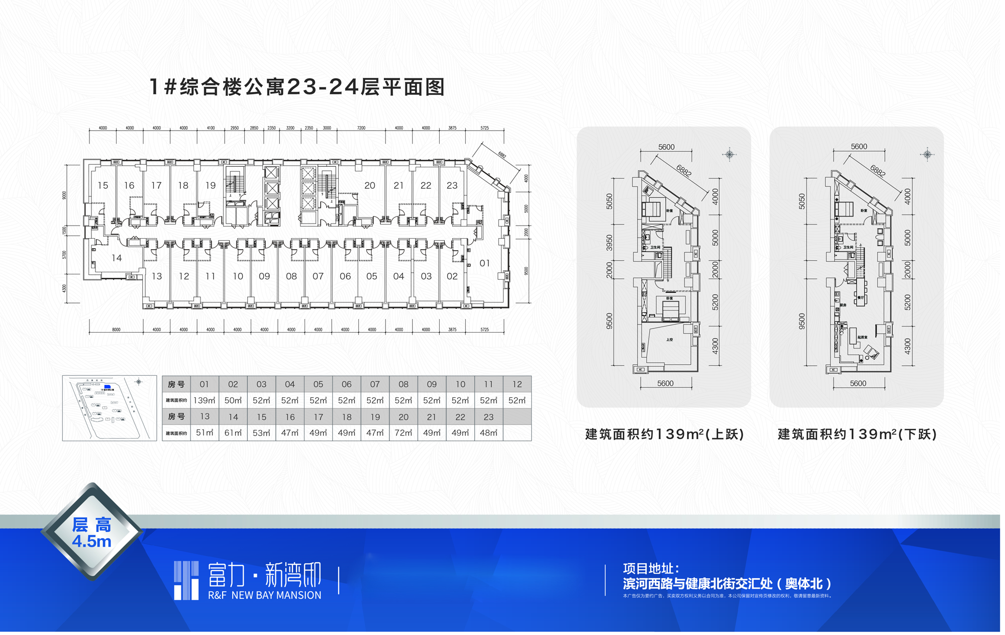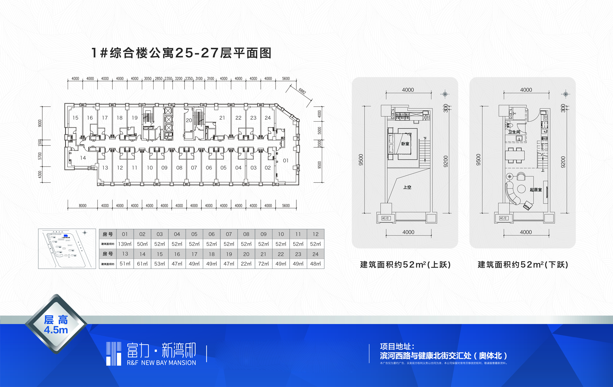 城市垂直综合体,规划理念来自新加坡的丹戎巴葛中心和日本的六本木,打破传统商业街区视野狭小层次单一的局限,以城市天际线和汾河云顶全景作为全新的消费场景,实现立体商业规划,垂直漫游小世界的奇妙商业消费体验。其中2层规划为精品餐饮,3-7层为社区商业及私人定制等生活美学配套,8-17层为商务办公空间,囊括网红空间\律师事务所\互联网金融\电子商务等多元复合型产业链,18-21层为汾河星空全景公寓酒店,22层规划为云中漫步健身会所,23-27层,层高4.5米,规划了云顶club\精英荟\揽月酒吧街等城市上层生活配套,自下而上会形成一个循环体,人们在这工作、在这玩乐、在这购物、在这招待好友、在这享受生活……所以,富力新湾邸并不仅仅是购物中心、住宅、写字楼、公寓,而是一座立体的微缩城市,项目总高27层,3-22F层高3.3米,23-27层高4.5米,以52-139㎡平层及loft多元轻资产,打造整个片区最为耀眼的“繁华之寓”。