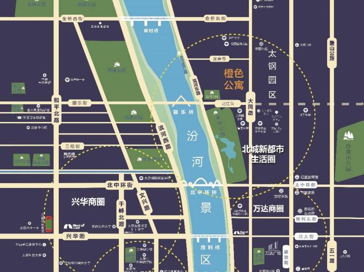 橙色公寓位于尖草坪区森林公园以北,大同路与龙康街交汇处。项目周围由三横三纵的交通网络组成,西侧紧邻滨河东西路,东侧大同路,北侧金桥街,南侧北中环、摄乐桥。通达性强,可快速到达机场、太原南站及各大商圈。