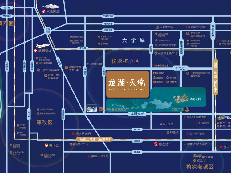“三横六纵”交通:三横—龙湖大街、文华街、龙城大街;六纵—太榆路、龙田(魏榆)路、定阳路、新建北路、中都北路,锦东大道,快速通达太榆全城。