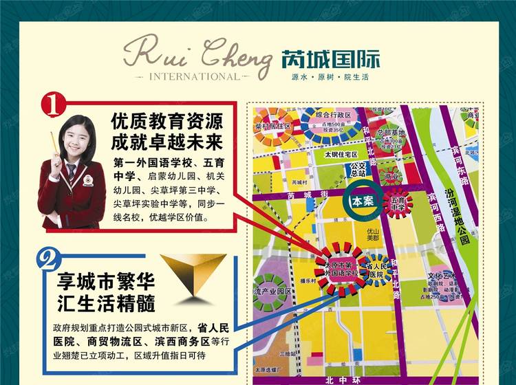 芮城国际,应传统物业业主对务实生活理念、愈加舒适的建筑规划、更加合理的生活动线之需求,历经反复考量论证,沿袭尖草坪区传统地脉,融合汾河湿地美景,集结城市优势商圈教育、医疗、公园等优质资源。