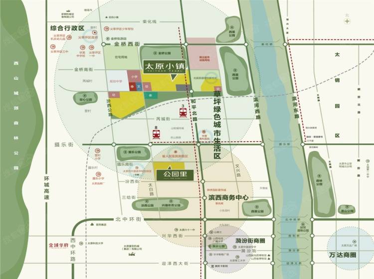 学校: 太原市外国语学校新校区(在建)、北辰双语学校新校区(规划)、尖草坪区实验小学、尖草坪区机关幼儿园等;