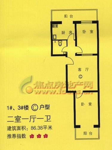 2室1厅1卫-花间小镇 1、3#楼 两室一厅一卫 86.38平米 C