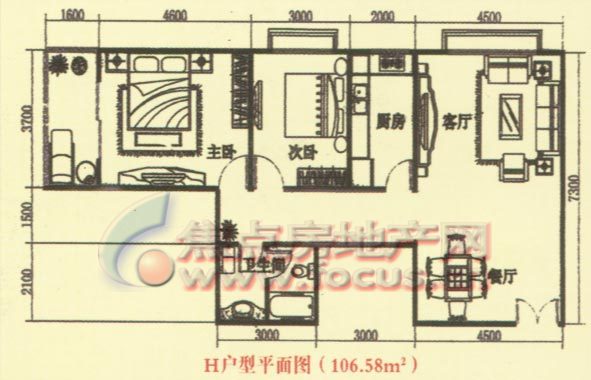 2室2厅1卫-国际大都会 两室两厅一卫 106.58平米 H