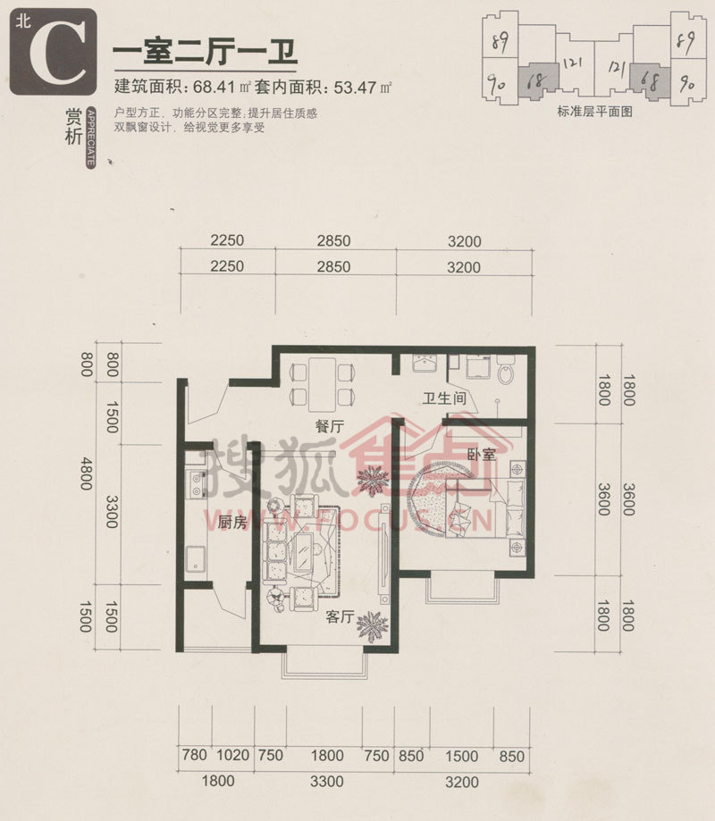 1室2厅1卫-美域中央 一室两厅一卫 68.41平米 北C