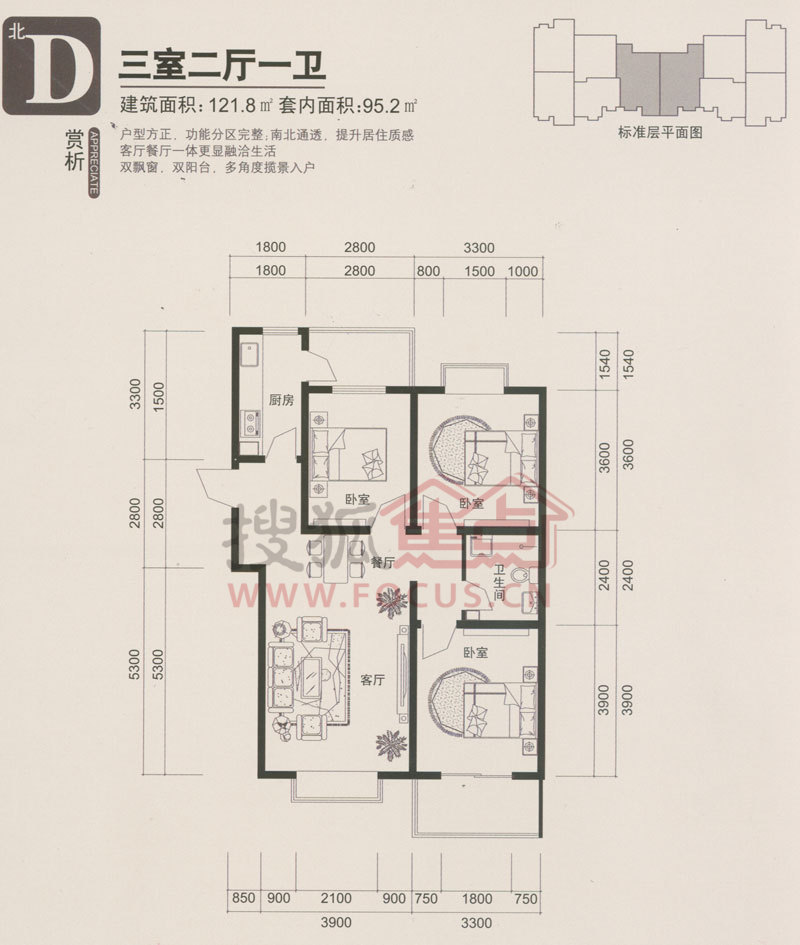 3室2厅1卫-美域中央 三室两厅一卫 121.8平米 北D