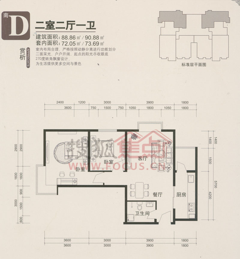 2室2厅1卫-美域中央 两室两厅一卫 88.86平米 南D