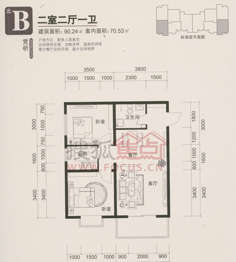 0室-美域中央 两室两厅一卫 90.24平米 北B