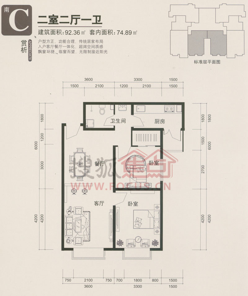 2室2厅1卫-美域中央 两室两厅一卫 92.36平米 南C