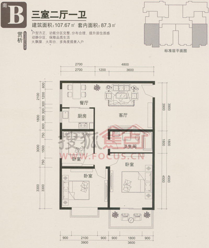 3室2厅1卫-美域中央三室两厅一卫107.67平米南B