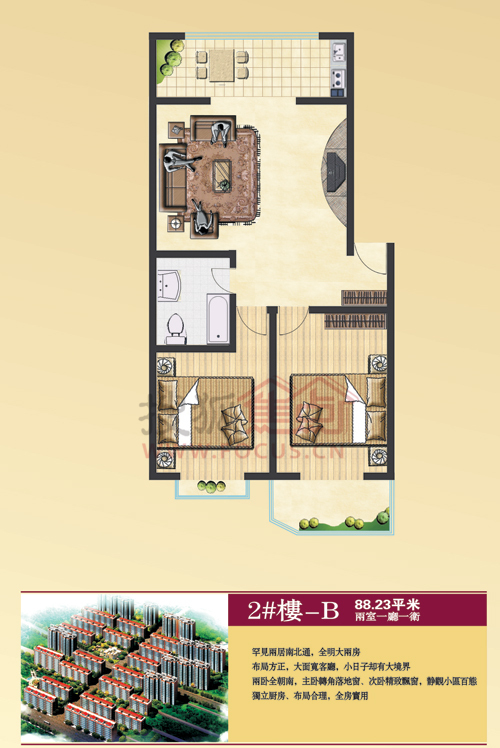 2室1厅1卫-世锦家园-2号楼B-两室一厅 88.23