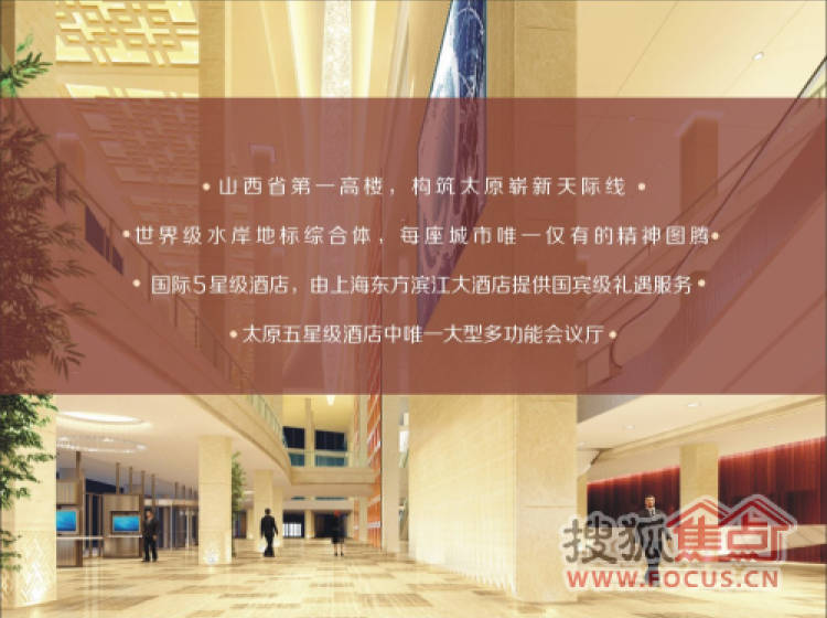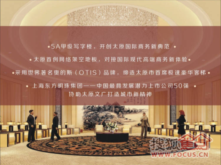 东方明珠湖滨广场写字楼,开创太原国际商务新典范。太原首创网络架空地板,对接国际现代高端商务新体验。采用世界著名奥的斯(otis)。山西省排名前列高楼,构筑太原崭新天际线。高级水岸地标综合体,每座城市仅有的精神图腾。国际酒店,由上海东方滨江大酒店提供国际级招待。拥有多功能宴会厅。