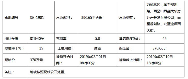 宗地编号为SG-1901的地块,四至:万柏林区,东至规划路、西至山西鑫大华房地产开发有限公司、南至规划路、北至迎泽西大街;土地用途为商业;出让年限40年;容积率5.0;绿化率15%。