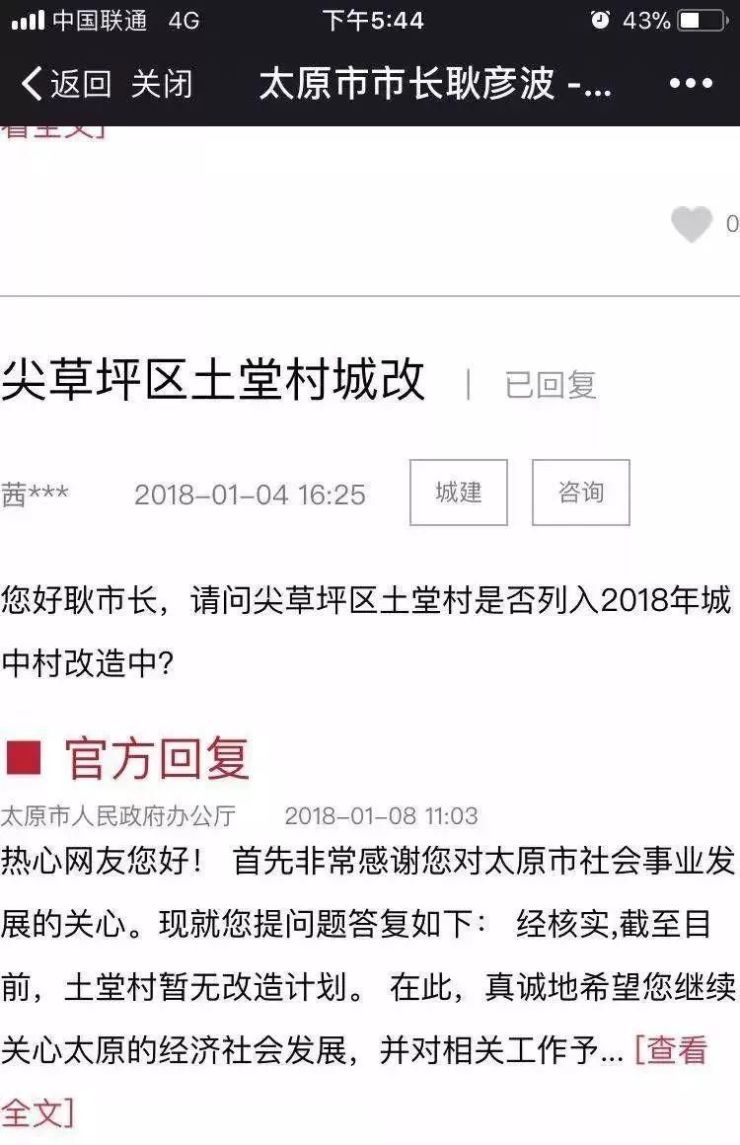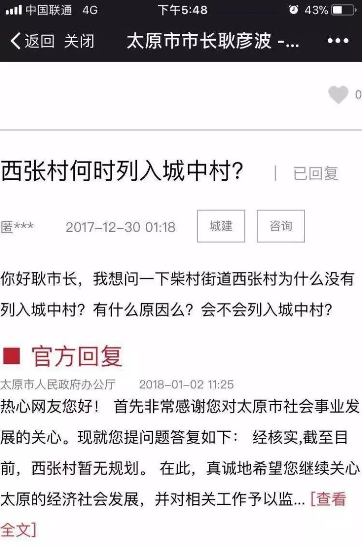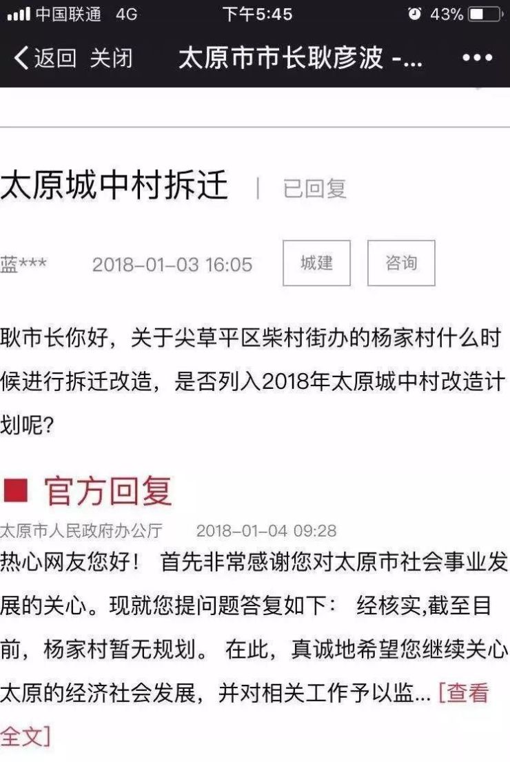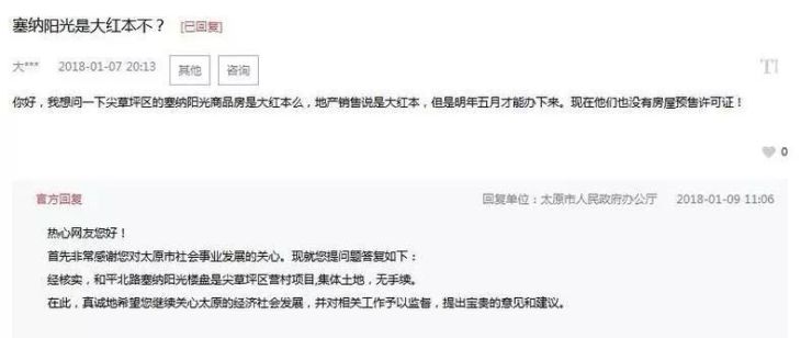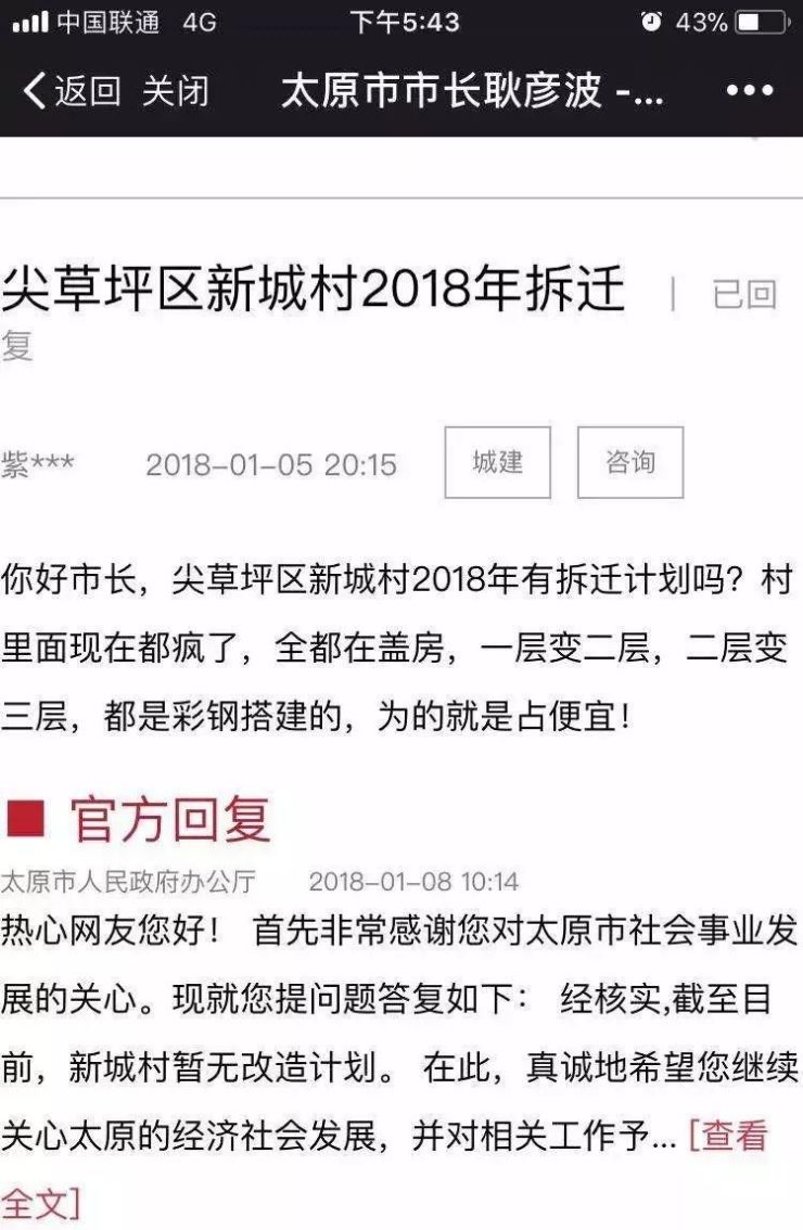 太原市人民政府办公厅官方回复