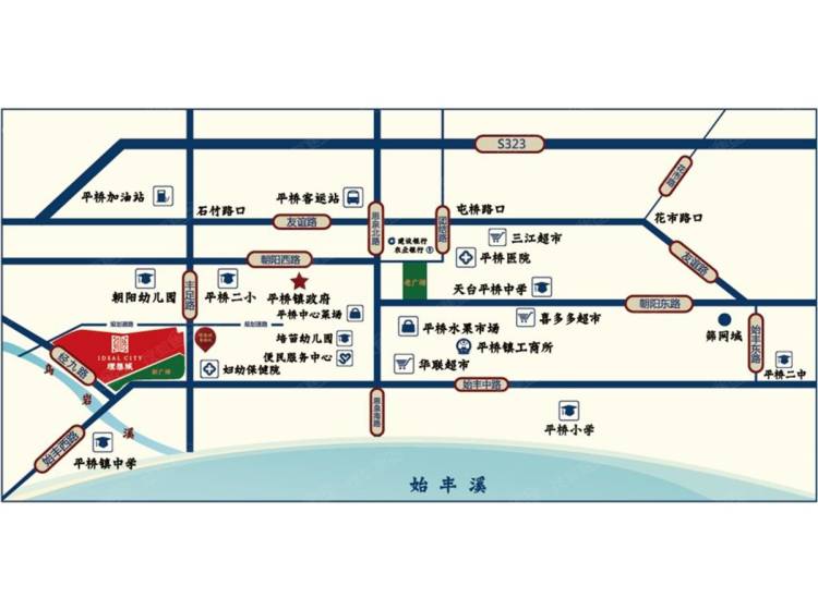 平桥镇是天台西部的行政枢纽,是天台县少有的国家重点镇、省级中心镇,随着城镇化进程的加快,杭绍台高速平桥出口的确定,大平桥的版图已清晰可见。理想城位于天台县平桥镇核心人居板块,处始丰溪北岸、乌岩溪畔上风上水之所在,东至丰足路、南接新广场、西临乌岩溪。作为平桥镇排名前列个城镇化的商品房开发小区,荣远房产十年磨剑、倾力打造,一流的设计理念、一流的施工工艺,一线的亲水景观,势必带来平桥人居环境的新变革!约25000㎡景观绿化,8000㎡中庭景观,400m健身景观跑道,约4500㎡商业配套,200m商业步行街,人车分流,24小时专业物管服务,优质学区,毗邻平桥小学、平桥镇中学。