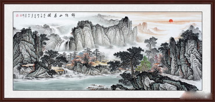 蒋伟新品八尺横幅山水画《锦绣山居图》,画面背景处是一坐山峰,碧峰崇立,嘉树成荫,山下云雾弥漫,流水潺潺;近景满目盈翠,树木掩映处,环抱瓦宅数栋,横跨两岸的木桥,都被描写的栩栩如生,画面一尘不染,浓浓的自然气息扑面而来。画家注重细节的描绘,增添了作品的气韵,表现出独特的山水意境,凸显出出画家深厚的传统笔墨功力。作品构图严谨,匠心独运,通过笔墨色彩的精细描绘,使宁静悠远的美景跃然纸上。