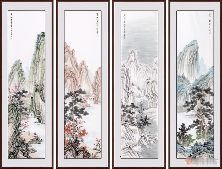 王宁老师的这幅四条屏山水画《春夏秋冬》,饱含作者对大自然的强烈热爱,用娴熟的技巧,出采的笔墨,勾勒出了北国四季分明的绮丽风光。春景生机盎然,夏季繁茂昌盛,秋景天高云淡,冬景安然悠闲。整体看之,虽形态各异,但浑然天成。画家用心良苦,为我们营造了一个宁静幽雅,平和清丽的意境。