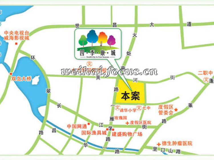 威海环翠省级旅游度假区是距市区最近和较具有发展潜力的区域之一,位于威海市区西海岸。三面环山,一面临海,气候宜人。这里有万亩生态森林——里口山高级森林风景区,有景色秀丽的双岛湾,绵延13公里的海岸线,3.5公里的沙滩,自然资源丰富。其发展定位是“威海市环翠区的新城区”、“韩国加工制造业的集中区”、“国内转移资本的聚集区”、“高新技术产业的密集区”和“休闲旅游度假区”。 “四季康城”就坐落在度假区的中心地带。坐北朝南,上风上水之位。规划总建筑面积4万平方米。由四幢小高层住宅和六幢多层住宅及一幢独立会所组成。 “四季康城”的规划设计将简洁明快的现代风格与江南特有建筑风格加以演变,配以小高层电梯住宅,整体风格现代、简约、淳朴、明快。点,线,面,无一不蕴藏着动感的旋律;立面,户型,园林,会所,将空间与建筑巧妙结合。 42—130平方米的多种户型配比,满足各层次需求,让每颗心都拥有纯粹私享的自由空间。在“四季康城”,在每天的生活中感受绿色、氧气、阳光、健康。
