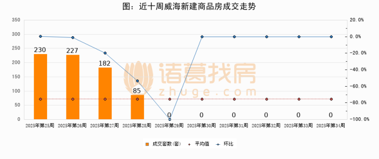 进入2025年第34周(08月18日-08月24日),威海新建商品房成交0套,较上周持平。从近十周成交来看,周均成交套数为72套,本周成交0套,低于近十周平均成交量100%。