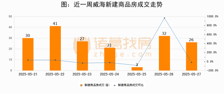 根据威海市住房和城乡建设局数据显示,2025年05月27日威海新建商品房成交26套,较昨日减少6套,环比下降18.8%。近一周威海新建商品房日均成交26套。05月27日单日成交26套,与近一周平均水平持平。